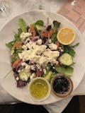 Romaine lettuce, spring mix, tomatoes, onions, cucumbers, feta cheese, kalamata olives and lemon juice.